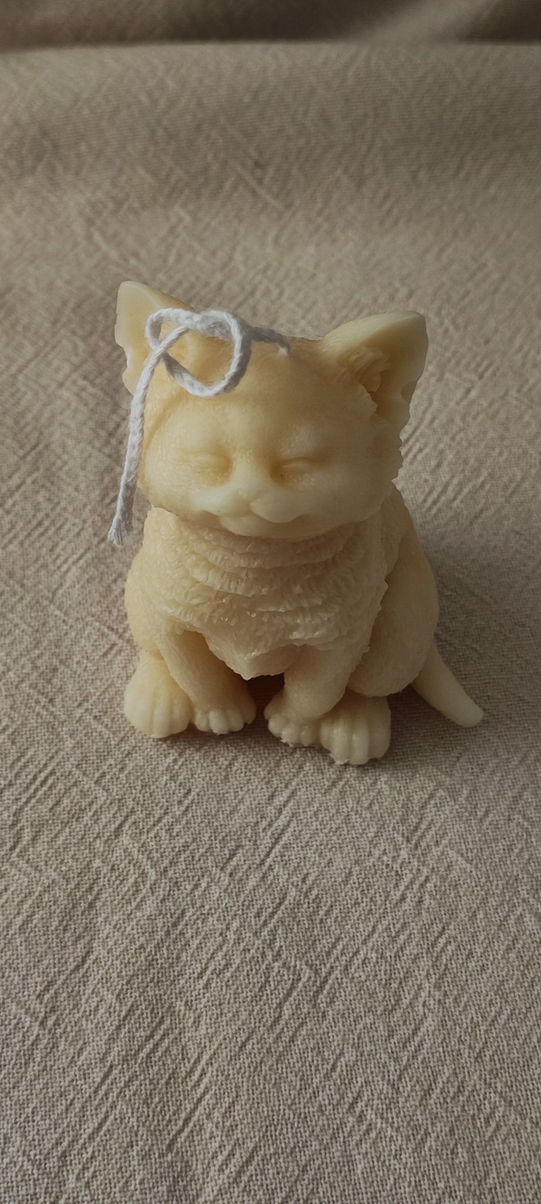 A delicate and beautifully detailed candle, handcrafted in the shape of a peaceful little cat.